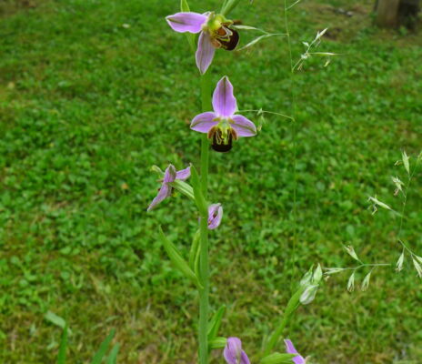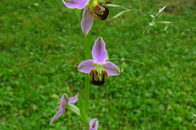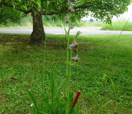 Es ist der Bienen-Ragwurz (Ophrys apifera), der auf kalkhaltigen, nicht gedüngten Boden in Trockenrasen vorkommen kann. In Franken kommt diese Orchidee zerstreut bis selten vor. In ausgesprochen warmen Gebieten in Südeuropa ist sie häufiger anzutreffen. In Deutschland gilt sie als stark gefährdet. Für Mädelhofen und Roßbrunn trifft dies nicht zu, sofern man sie wachsen und gedeihen lässt und die Orchidee den für ihre Ansprüche passenden Standort vorfindet. Sie bevorzugt lichten Baumschatten und kargen Boden und ganz wichtig man muss sie in Ruhe lassen. Die Pflanze ausgraben und versetzen oder pflücken oder vorzeitig mähen verträgt sie nicht und geht kaputt bzw. man mindert ihre Verbreitung.